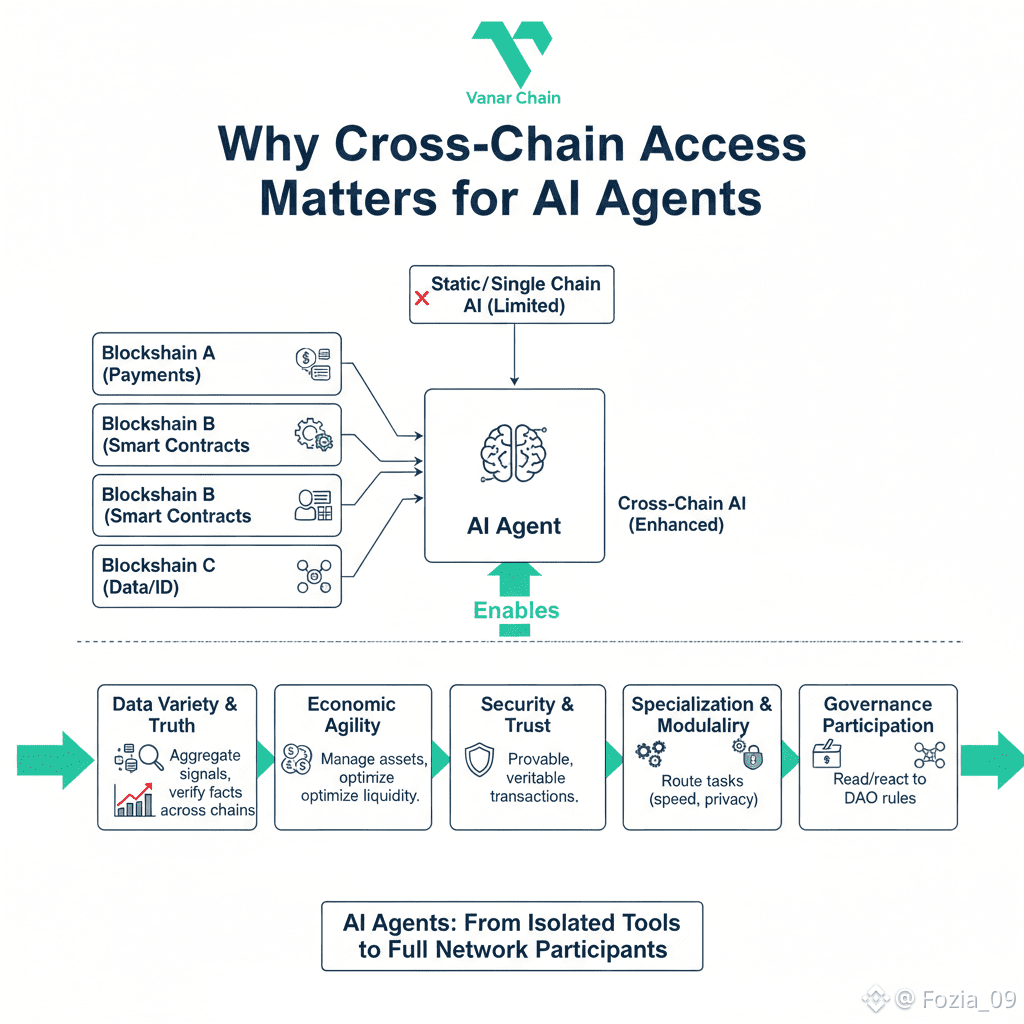 At the core,AI agents run on data variety.No single chain has it all some chains are built for payments,others for smart contracts, identity,storage,or governance.If you keep AI stuck on one chain,you’re cutting them off from the bigger picture.They work with missing information and limited tools.Let them move across chains,and suddenly,they can pull in new signals,check what’s true, and act on insights from all over at the same time.