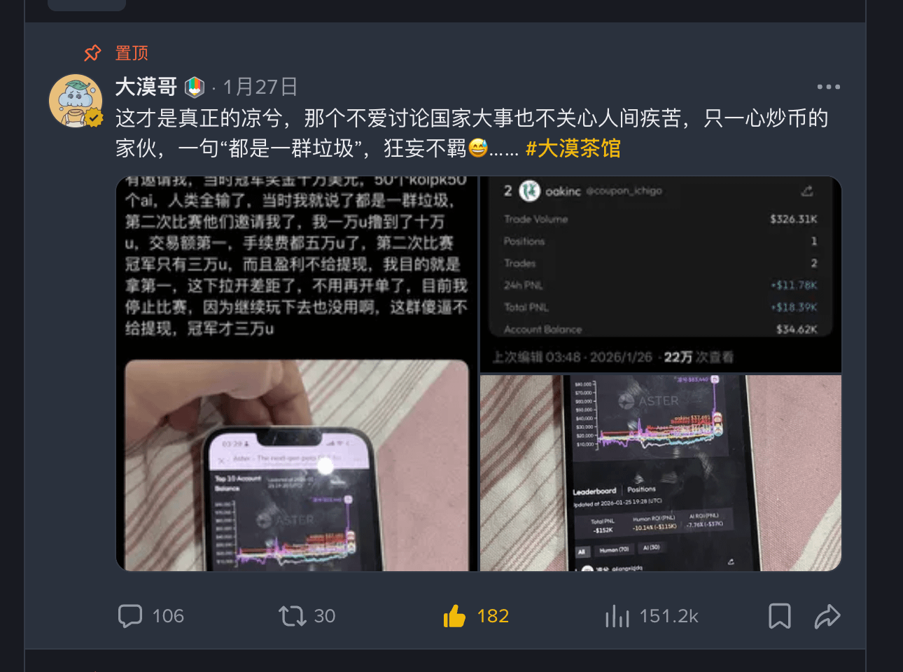 Hợp đồng ASTER của ngày hôm qua đã trở thành tâm điểm của cả mạng. Trader nổi tiếng "Lương Hề" đã thể hiện sức bùng nổ đáng kinh ngạc trong cuộc thi, từ 10.000 U vốn một thời đã đạt đến 100.000 U, kịch tính như "tàu lượn siêu tốc" này không chỉ là một buổi biểu diễn giao dịch cá nhân, mà còn là một bài kiểm tra "áp lực" cứng rắn cho tính thanh khoản và cơ chế của nền tảng ASTER.