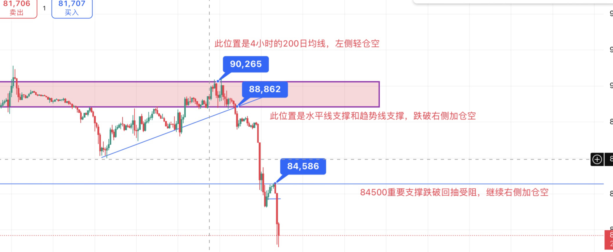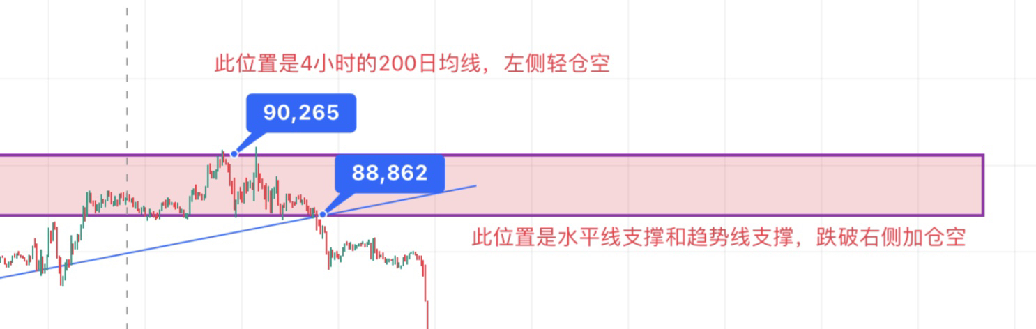Bitcoin đã tăng lên khoảng 90500 và bị cản, lệnh bán bên trái đã được thực hiện, dừng lỗ 1000 điểm, như hình dưới đây, khoảng 88888 là mức hỗ trợ ngang và mức hỗ trợ đường xu hướng, sau khi giảm xuống dưới mức này đã thực hiện việc tăng cường bên phải, vị thế đã đầy.