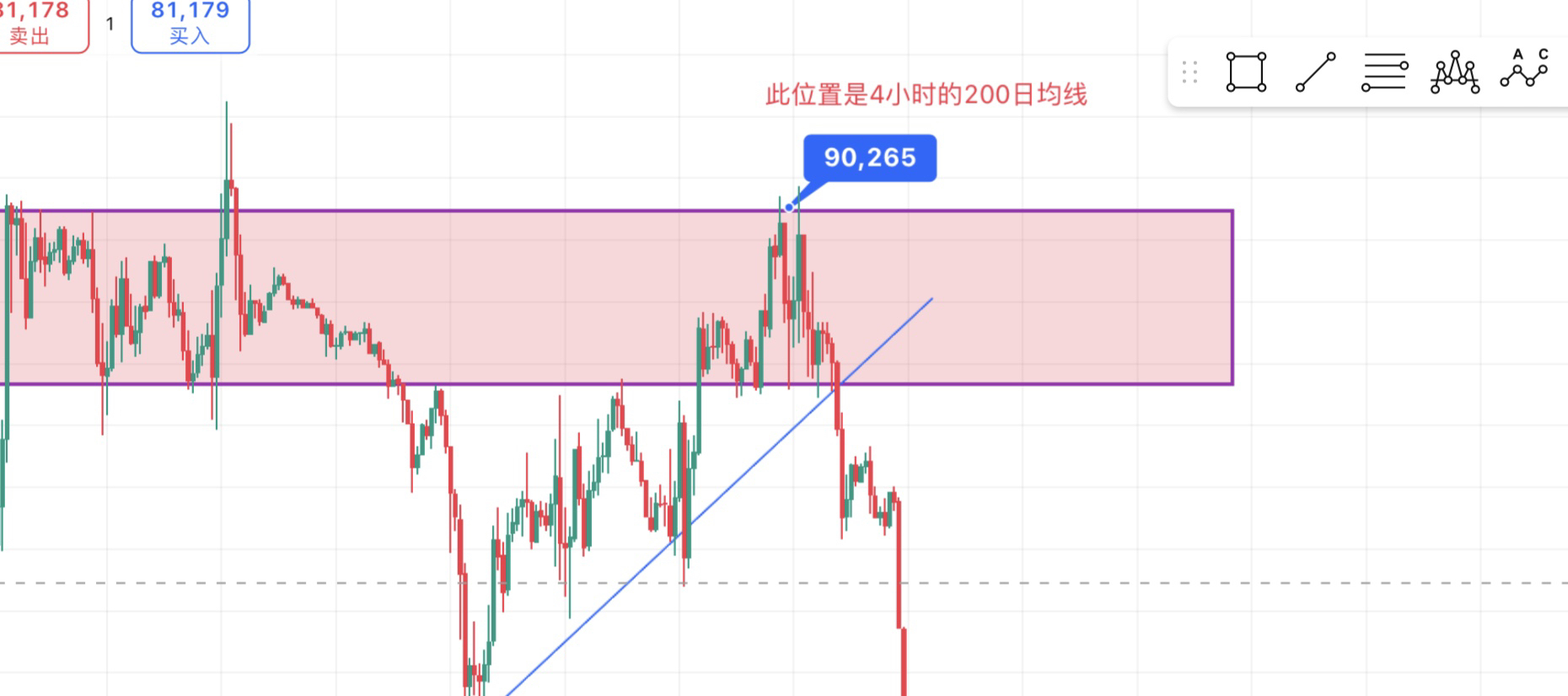 Thời gian quay lại ngày 28 tháng 1, lúc này Bitcoin $BTC phá vỡ 88400 tiếp tục tăng, mở biểu đồ nến 4 giờ như hình dưới đây, tìm điểm kháng cự ngang gần 90300, sau đó mở đường trung bình 200 ngày trong 4 giờ, khoảng gần 90800.