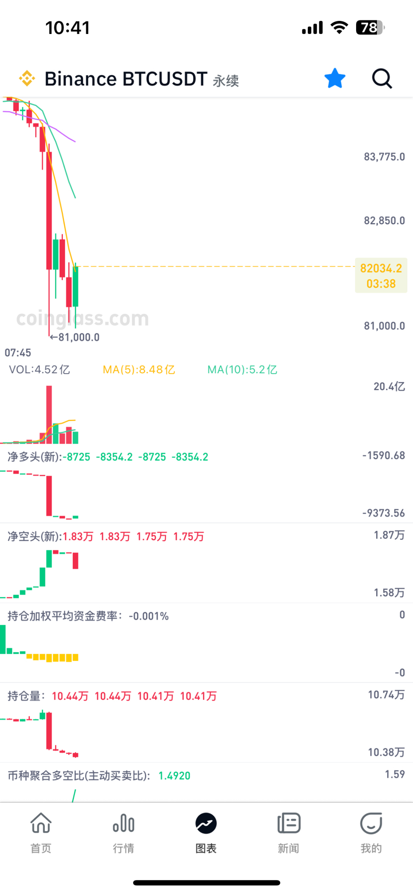 Thị trường tiếp tục giảm như mong đợi, khi chuyển sang biểu đồ ngày phát hiện, mức thấp trước đó ở khoảng 81000, Bitcoin cũng đã chạm đến 81100, nhanh chóng phục hồi lên khoảng 82000, như hình dưới đây mở Coinglass, bên bán đang rút lui, tỷ lệ tài chính âm, cho thấy vị trí này có hỗ trợ, có nhu cầu phục hồi, vì vậy lệnh bán đã chốt lời phần lớn, giữ lại vị thế cơ bản để tiếp tục theo dõi.
