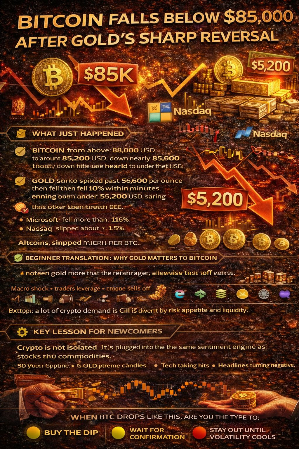 ⚠️ Tôi là Storiesofcoins — Bitcoin đã giảm xuống dưới 85,000 USD sau khi vàng có sự đảo chiều mạnh. Đây là một bài học đơn giản cho người mới: khi vĩ mô chuyển sang rủi ro thấp, crypto thường cảm nhận điều đó ngay lập tức.