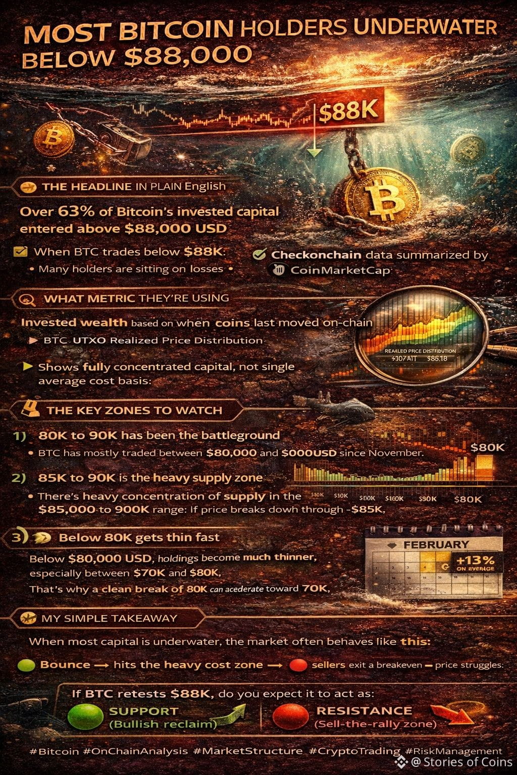🚨 I’m Storiesofcoins — here’s the on-chain reality most beginners miss: below 88,000 USD, a large share of Bitcoin’s invested capital is underwater, and that can change market behavior fast. (coinmarketcap.com)