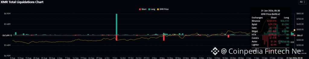Monero’s price rally was triggered by a clear imbalance in liquidation flows. According to the latest data at 31 Jan 2026, 05:30, with XMR priced around $490.42, total short liquidations reached approximately $324k compared to just $41k in long liquidations, an almost 8:1 skew. Binance accounted for the bulk of the flush, with $235.6K in short liquidations versus $34.3K in longs, while Bitget saw $51.9K in shorts against $3.25K longs. Bybit added another $29.1K in short liquidations, with negligible long-side pressure. Several exchanges showed short-only liquidations, reinforcing that the move was structurally one-sided.