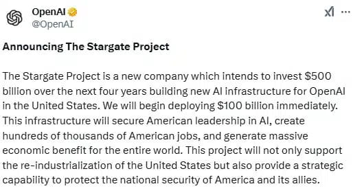 通过这个项目,公司计划在美国建立由人工智能操作的数据中心,同时创造100,000个新的美国就业机会。特朗普在新闻发布会上透露,OpenAI、软银和甲骨文领导了投资集团,将立即向该项目投入1000亿美元。