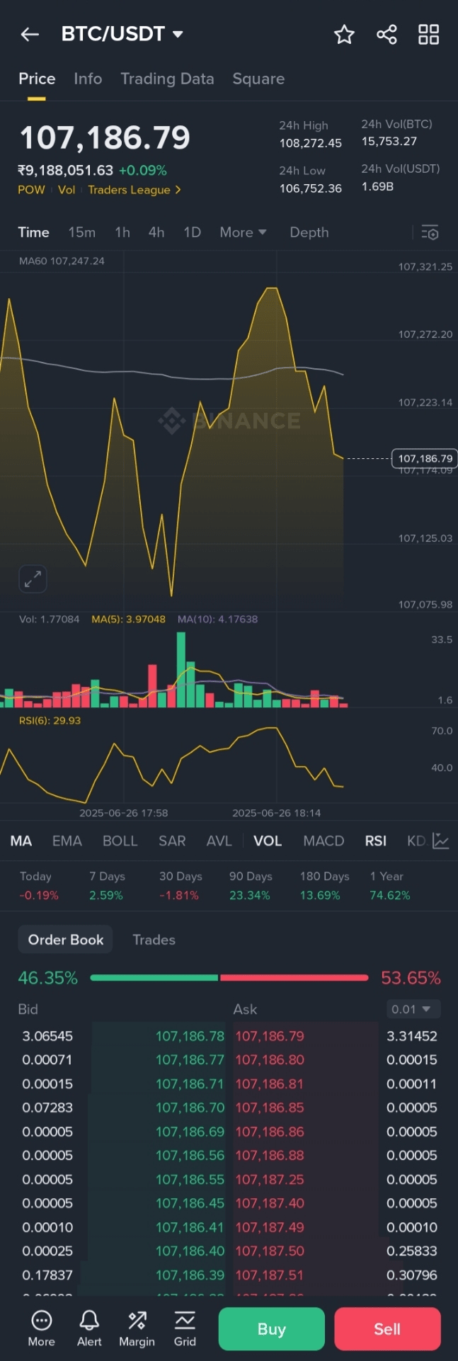 盘中最高价为108146.0美元,盘中最低价为107006.0美元。