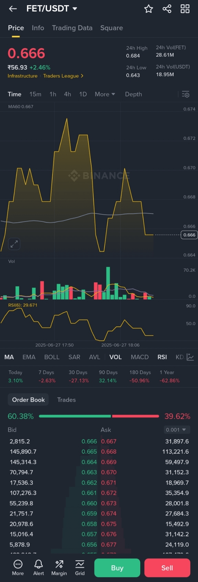 $FET (Fetch.ai) 交易价格约为 \$0.66,今天上涨 \~2.4%,在 \$0.65–\$0.68 范围内波动。