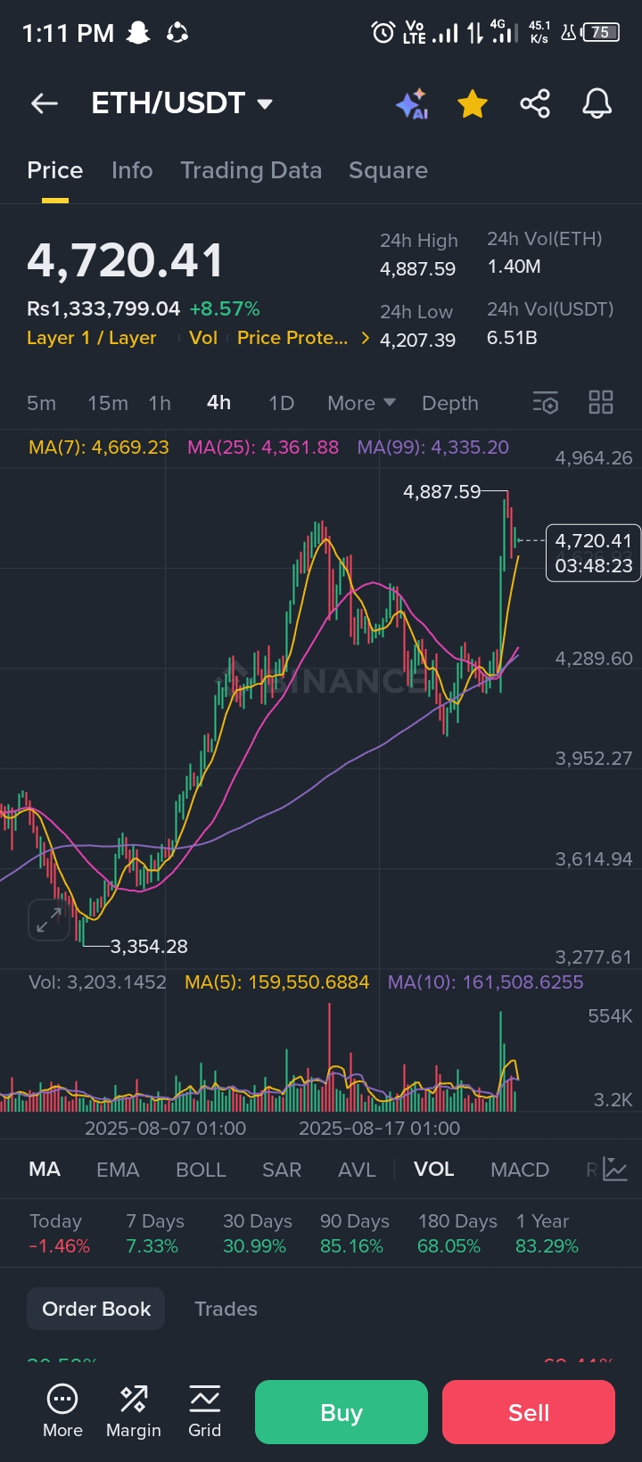 以太坊交易在所有主要移动平均线(MA7、MA25、MA99)之上,表明强劲的上升趋势。价格在$4,720水平附近整合,此前上涨了显著的+8.57%。