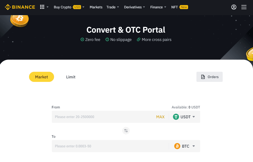 您不必使用可能会滑点的市场订单,而是简单地打开 Binance Convert。您在“从”字段中选择 BTC,在“到”字段中选择 USDT。您输入要确保的比特币数量。