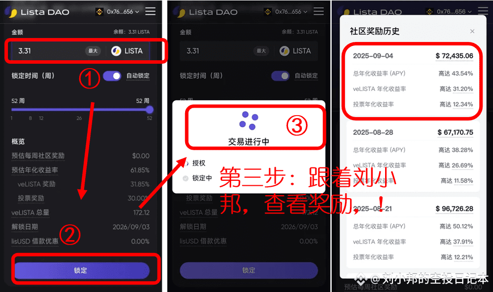 锁定完成后,在“Your Lock”板块即可查看veLISTA持有量、累计收益及解锁倒计时,收益支持自动复投或手动领取至钱包。
