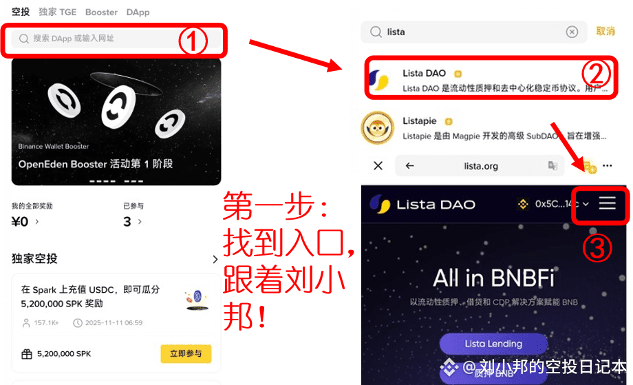 8月21日、8月28日、9月4日都发了空投+投票奖励!我因为质押金额比较大,三期一共撸了1293.12U,资金小的最少7U就可以参加Lista质押活动,接下来我给大家写一个参与教程: