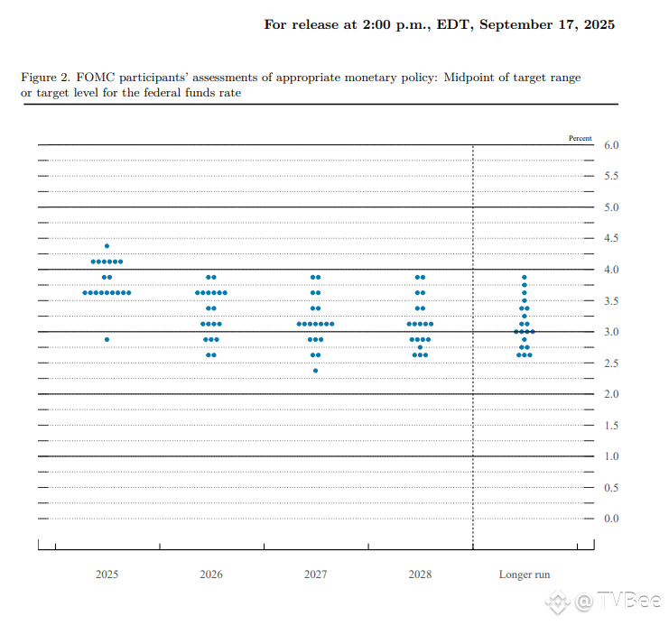 按照2025年降息3次,也就是年底利率3.5~3.75考虑,可以看见点阵图给出2026年的利率预测: