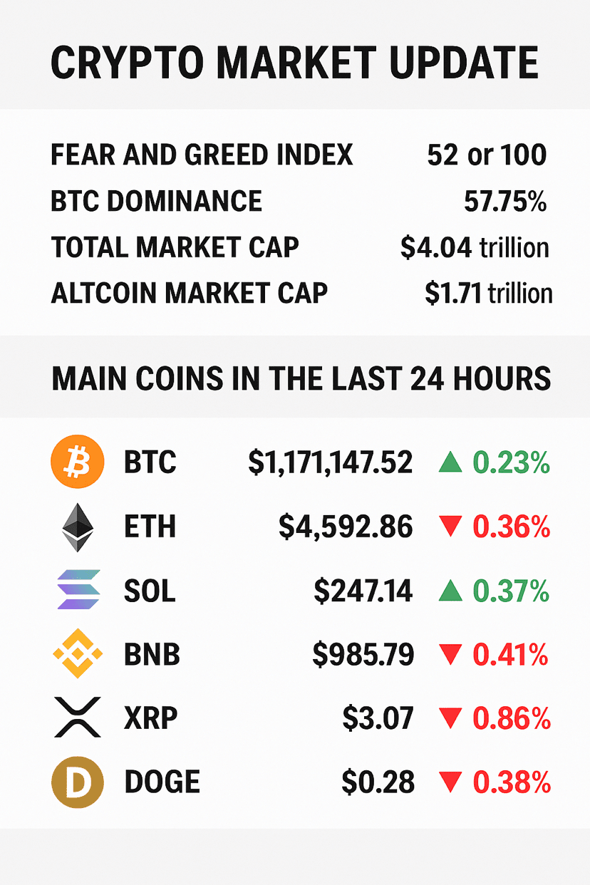加密货币市场显示出平衡的情绪,恐惧与贪婪指数为 52/100,反映出中性的展望并略有上升。比特币的市场占有率保持在 57.75% 的平稳水平,显示 BTC 在整体市场中的稳定性。