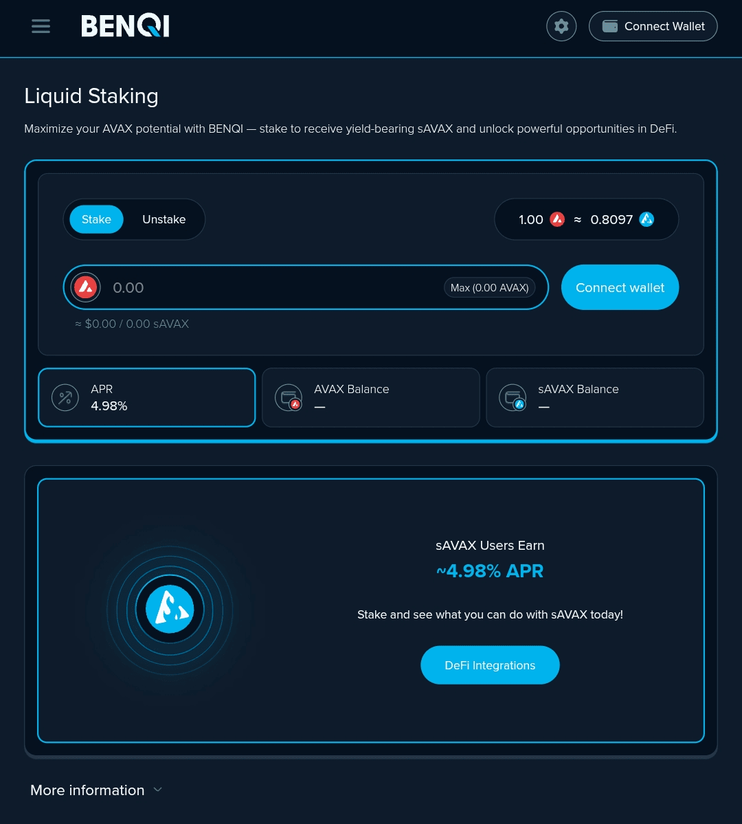 流动质押:质押AVAX并接收sAVAX,一种可以在DeFi中使用的收益代币。(查看图像标记以获取当前APR。)