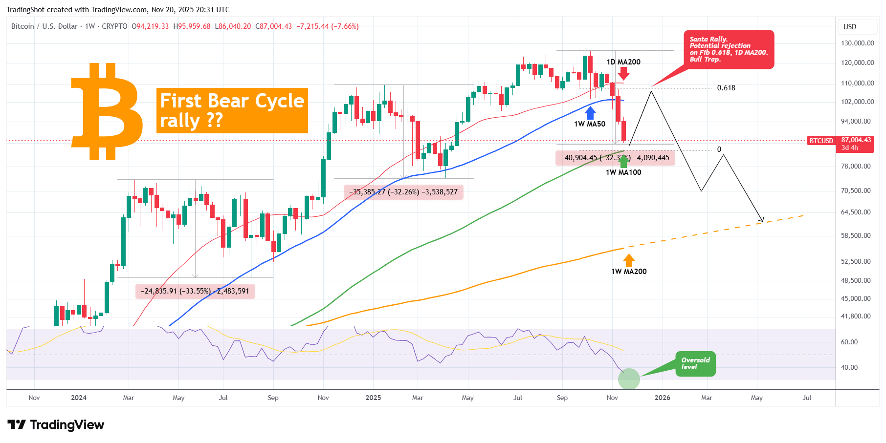 现在是我们可能看到反趋势反弹的时候,这是这个熊市周期中的第一次。首先,比特币刚刚完成了总共 -32.30% 的下跌,正如 2025 年 1 月 - 4 月的调整完全相同,且与 2024 年 3 月 - 8 月的 -33.55% 的调整一致。这就是我们预测 86600 - 83600 区间作为这个熊市周期的第一个技术支撑区和潜在反弹候选区的原因。与此同时,1W RSI 正在接近 30.00 的超卖门槛,这进一步增强了反弹的概率。