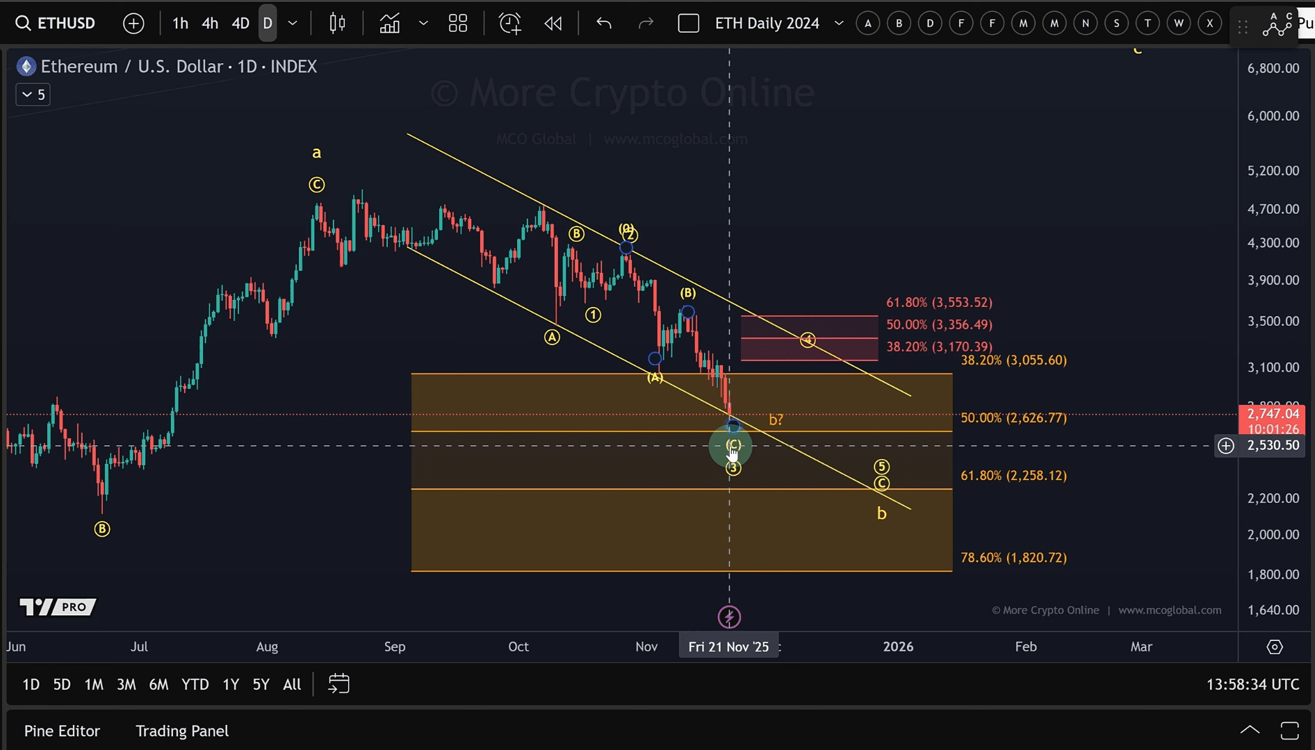 在更大的时间框架上,$ETH 正在完成C浪下跌,这本身应该在五浪中展开(1–2–3–4–5)。
