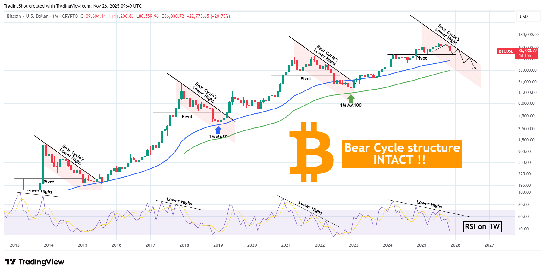 正如你所看到的,那条趋势线在所有周期性修正中一直存在,基本上是熊市周期的自然阻力水平。基本上,每个熊市周期的整体结构都类似,还显示了一个枢轴趋势线,这条线要么是之前的高点,要么是支撑,一旦被突破,就会强烈抛售,持续向周期底部推进。前两个周期(自2014年以来)在它们的1M MA50(蓝色趋势线)上见底,而最后一个周期则在1M MA100(绿色趋势线)附近见底。