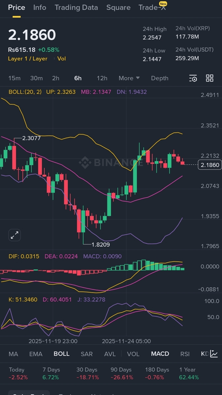 XRP $XRP 正在显示出在阻力位后的疲弱,随著低点形态的形成,价格回落至下降趋势线内部。这一动作使得多头动能完全失去力量,卖家在2.30附近重新回到市场。最小阻力的路径指向1.90-2.00,除非多头突破这个障碍。 📉
