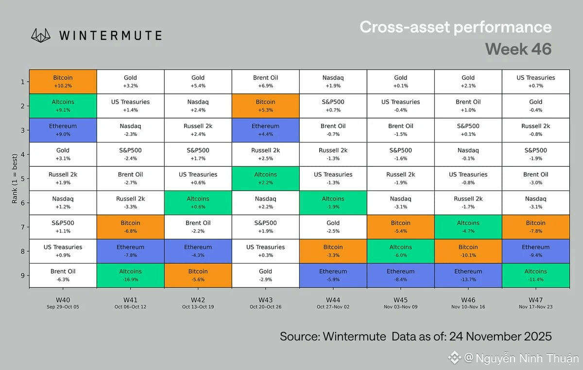 • Thị trường altcoins còn tệ hơn, trong khi S&P 500, Nasdaq và vàng liên tục lập đỉnh mới hoặc tăng mạnh.