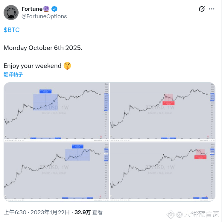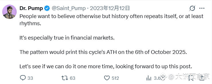 而且这不是偶然的巧合,不止一个博主在2023年提到了这个见顶日期,下面另外一个博主的帖子,同样也暗示2025年10月6日就是本轮牛市顶部。