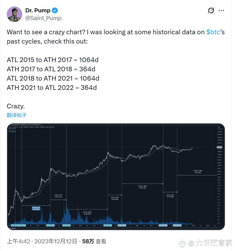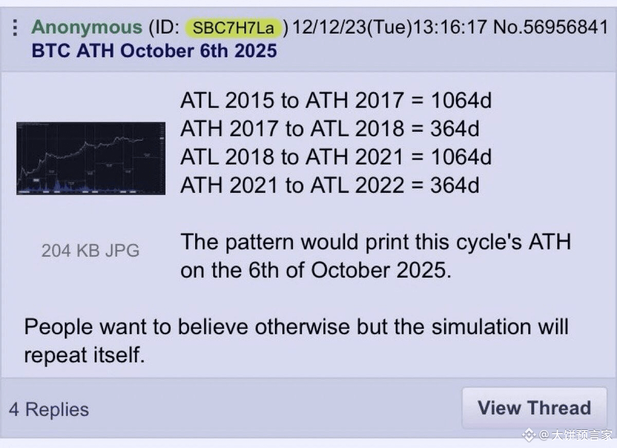 这篇帖子的意思是,大饼历史上每轮牛市的天数是1064天,每轮熊市的天数是364天,如果按照这个规律,本轮牛市的见顶日期是2025年10月6日。