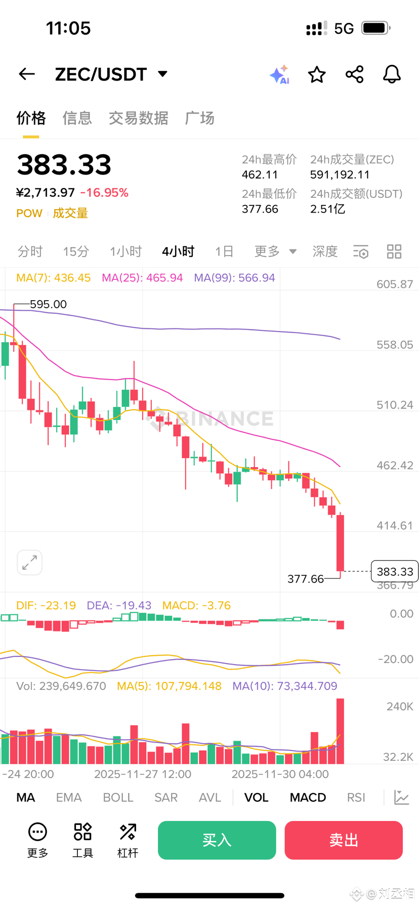 兄弟们,爆了没?今天一打开交易所,满屏都是绿的,唯独ZEC绿得发慌——不过是往下的那种。价格直接从前两个月的高光时刻,一头栽进深渊,24小时暴跌近17%,这跌幅,看得人肝儿颤。