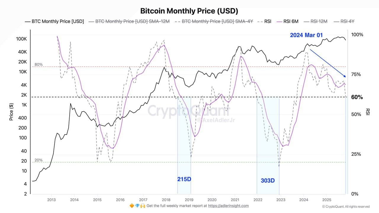 然而,尽管大型参与者在购买,比特币的长期动能正在减弱。从2024年3月起,月度RSI缓慢下降,已降至60%以下。从历史上看,在过去的周期中,当RSI从过热区域转入当前水平时,市场通常需要大约200-300天来形成新的可持续增长。根据这一模型,形成长期底部的可能时期大约是从2026年6月到10月。