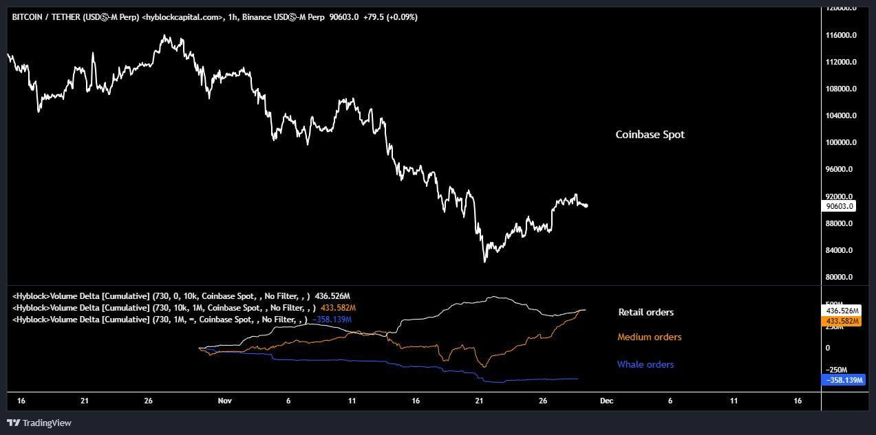 分析师指出,Coinbase上的大型买家再次活跃。根据CVD的数据,从1万美元到100万美元的现货订单转为净积累——这在局部底部之后立即开始。对于新手来说:这样的购买通常表明大型持有者(他们常被称为“鲸鱼”)开始在长期内建立头寸,做到这一点是连续的,没有剧烈的波动。