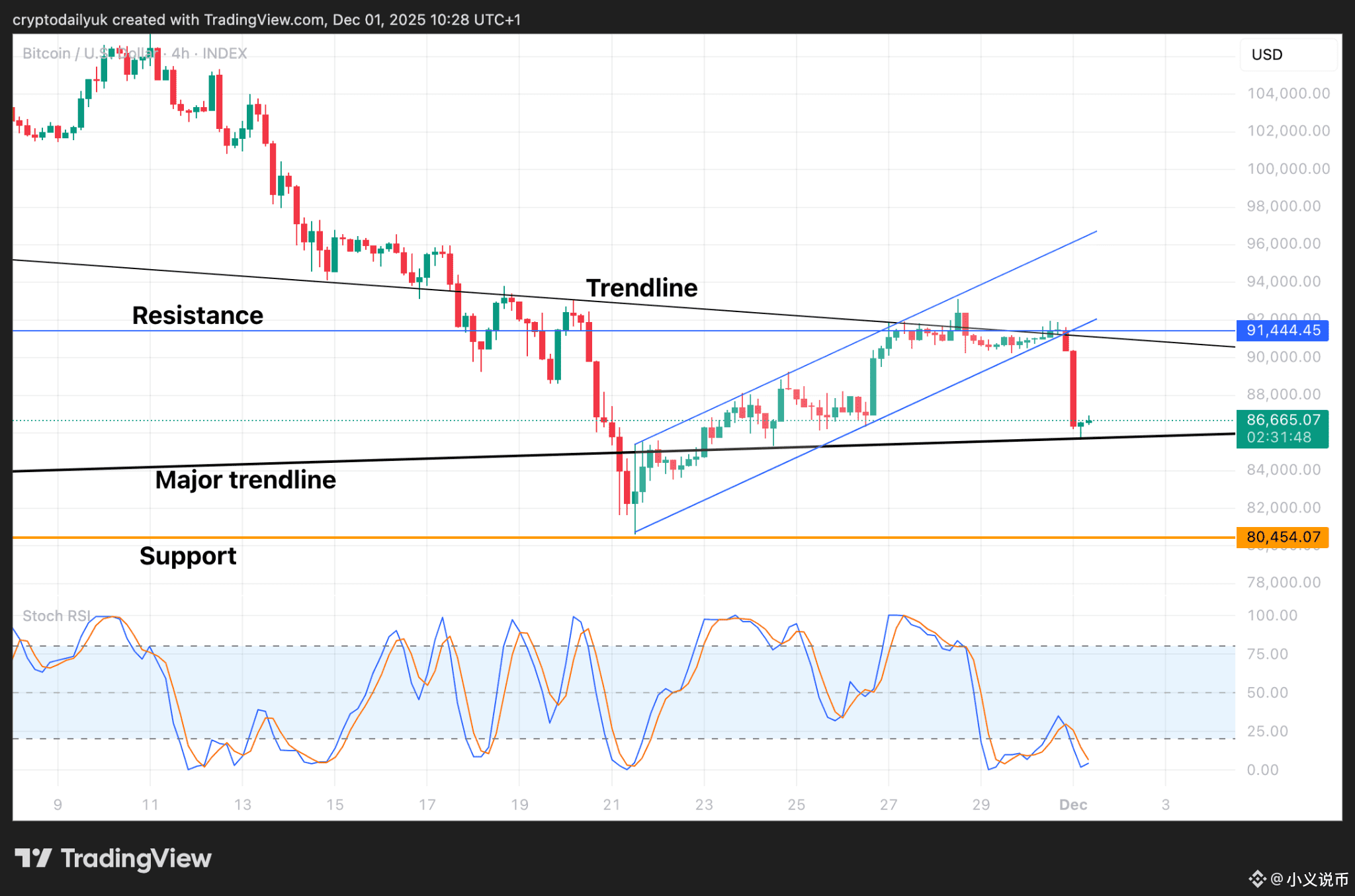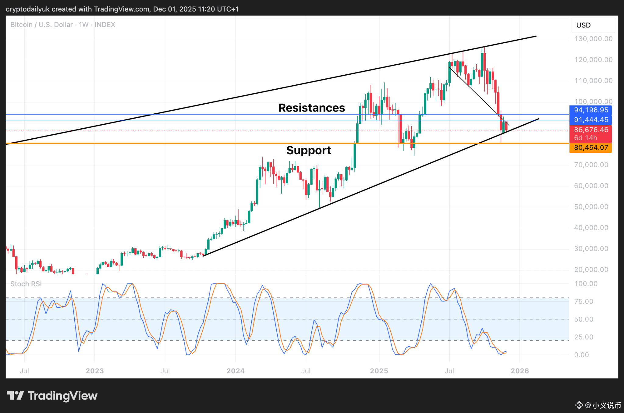 周线图的变化表明,此前从历史高点开始的令人担忧的回调已经停止。比特币价格是否会经历与10月份类似的盘整后大幅下跌?这当然有可能,尽管这次随机相对强弱指数(Stochastic RSI)指标已经触底反弹,现在又开始向上交叉。