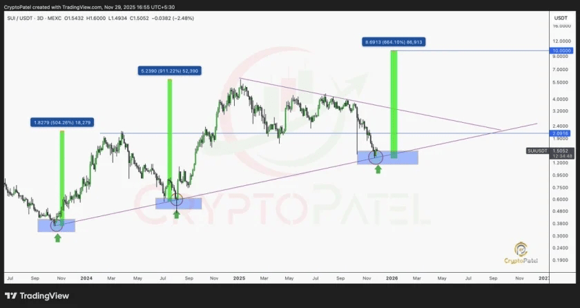 SUI 目前交易价格为 $1.55,正好位于一条长期上升支撑线之上,该支撑线在之前的周期中引发了重大反弹。价格已进入 $1.30 和 $1.60 之间的强需求区间,历史上买家在此积极进场。只要 SUI 保持在 $1.40 之上,结构将保持完整,维持另一个高时间框架反转的潜力。