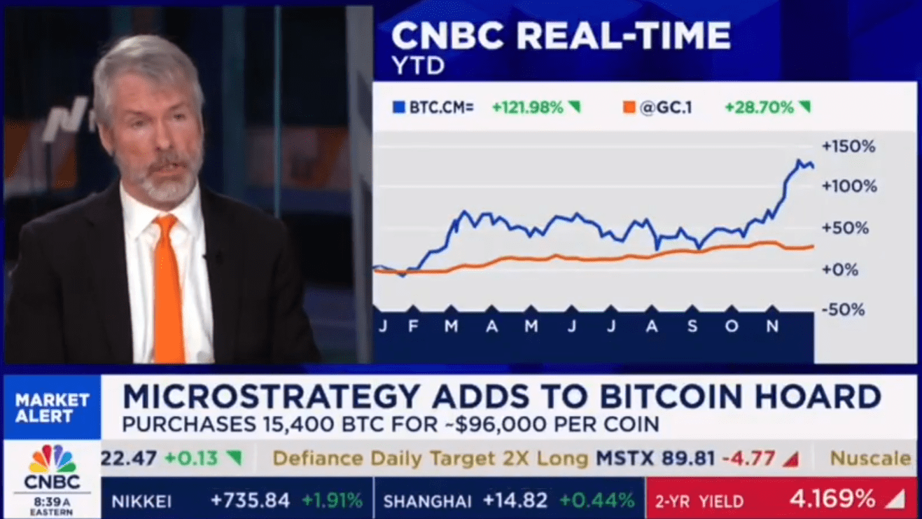 据报道,迈克尔·塞勒警告称,$BTC 可能飙升至 180,000 美元,然后戏剧性地跌至 140,000 美元,他建议这一举动会引发广泛的恐慌。这一预测分裂了社区。与此同时,MicroStrategy 继续积极累积比特币,最近购买了 15,400 BTC。