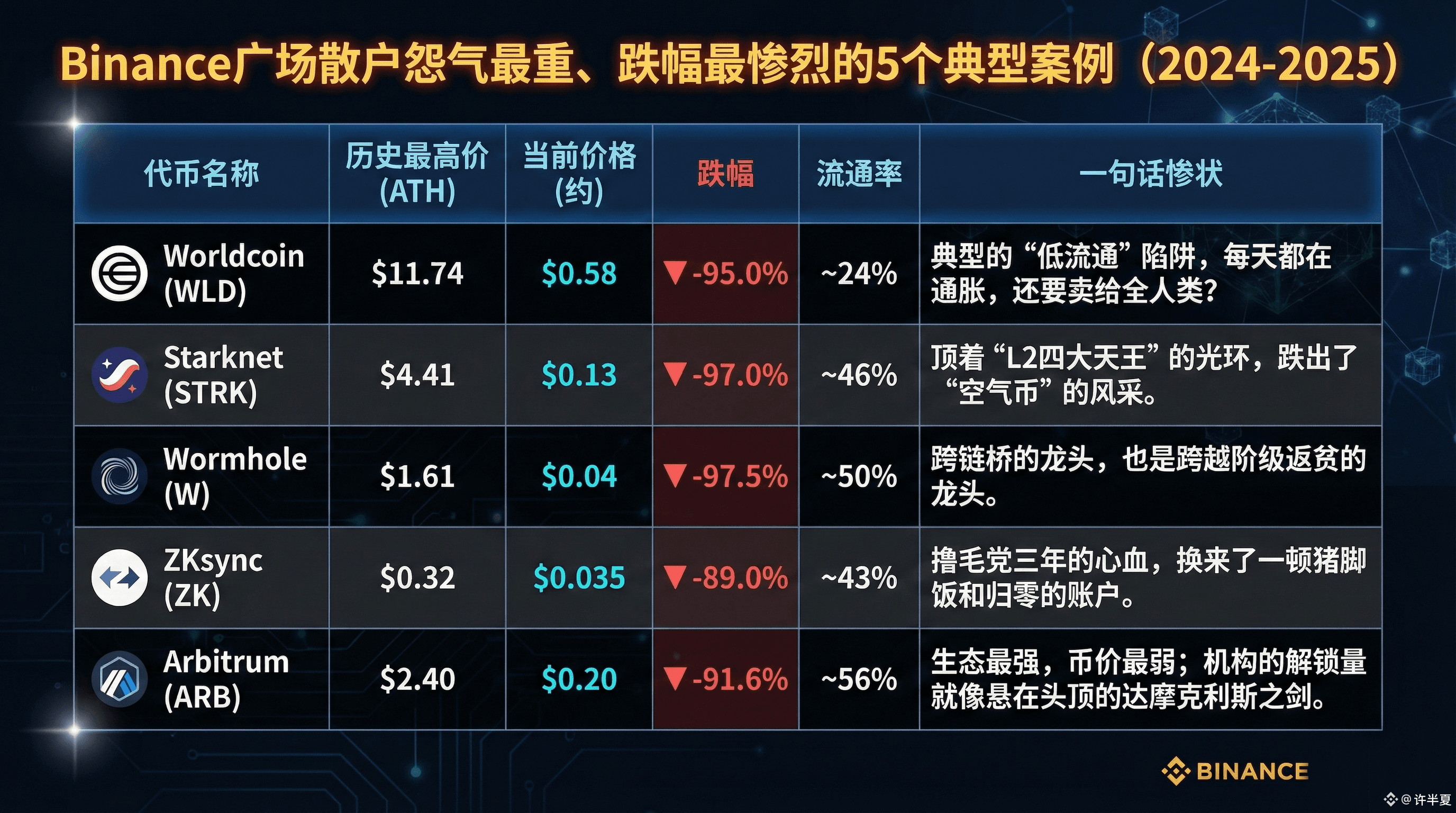 这个话题引起了大家讨论,看着这张图里跌幅 -90% 起步 的 WLD、STRK、ZK...
