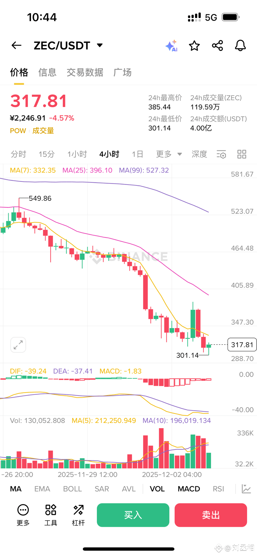 如果你还在关注ZEC,或许你已经被那些光鲜的“机构动向”“隐私升级”和“ETF申请”迷惑了双眼。但请先看一眼价格——317.81,看似三位数,实则早已站在悬崖边。从385.44的高点一路滑向301.14,跌幅超过20%,这不是波动,这是一场早有预谋的撤退。