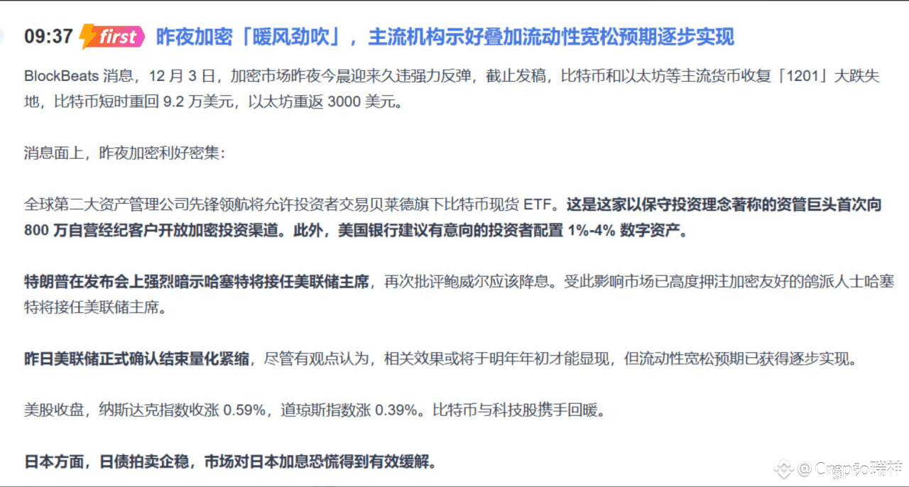 先锋领航开放比特币ETF、美联储结束紧缩、特朗普力挺加密友好主席……这一连串利好像炮弹一样砸向市场,确实给足了上涨理由。但你知道吗?在金融市场上,“利好出尽就是利空”。当所有人都知道利好的时候,往往就是聪明资金开始考虑撤退的时候。昨天的暴涨,很可能已经透支了这些利好的短期预期。