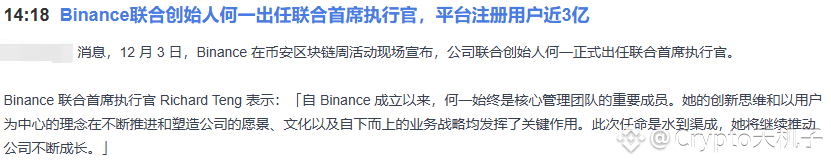 刚刷到币圈重磅:Binance联合创始人何一直接升任联合CEO!平台注册用户都快3亿了!老韭菜都知道,何一不是“新面孔”——她是币安从0到1的核心推手,管过社区、搞过产品创新,连老外CEO Richard都夸她“对用户和文化的理解无人替代”。这消息啥意思?简单说:币安要更稳、更猛地冲“十亿用户”目标了!平台稳,BNB作为“亲儿子”,基本面直接被焊死在“利好buff”上——这是今天反弹的第一个底气!
