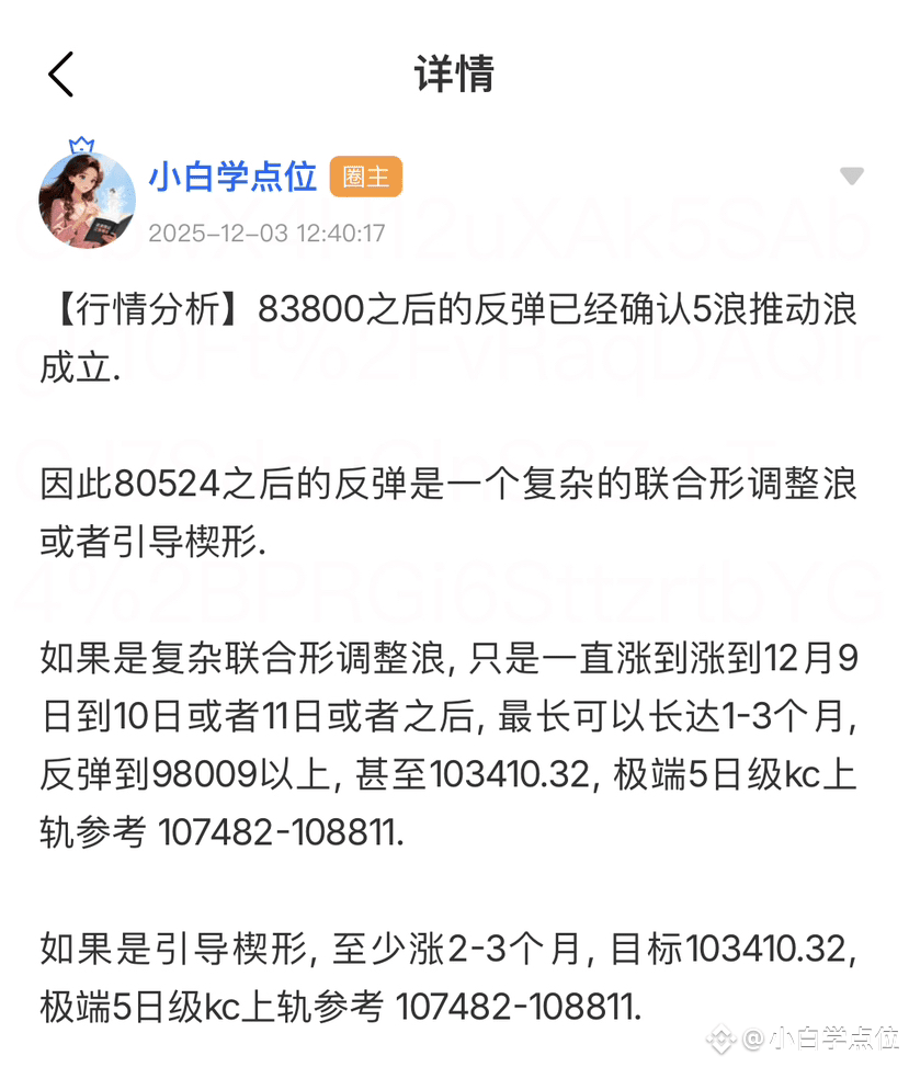 12月3日我全网第一个提出【83800之后的反弹已经确认5浪推动浪成立. 因此80524之后的反弹是一个复杂的联合形调整浪或者引导楔形.