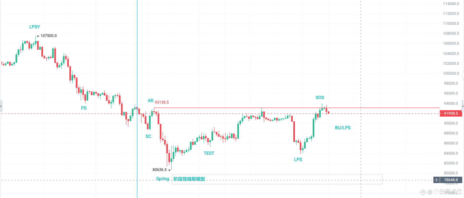 能不能抄底, 需要看【伟科夫吸筹模型】, 我们看到, 目前出现了 SOS高点(94181), 站上了AR高点93080的上方, 接下来就有 BU/LPS 低点, 这是我们最后的上车机会!