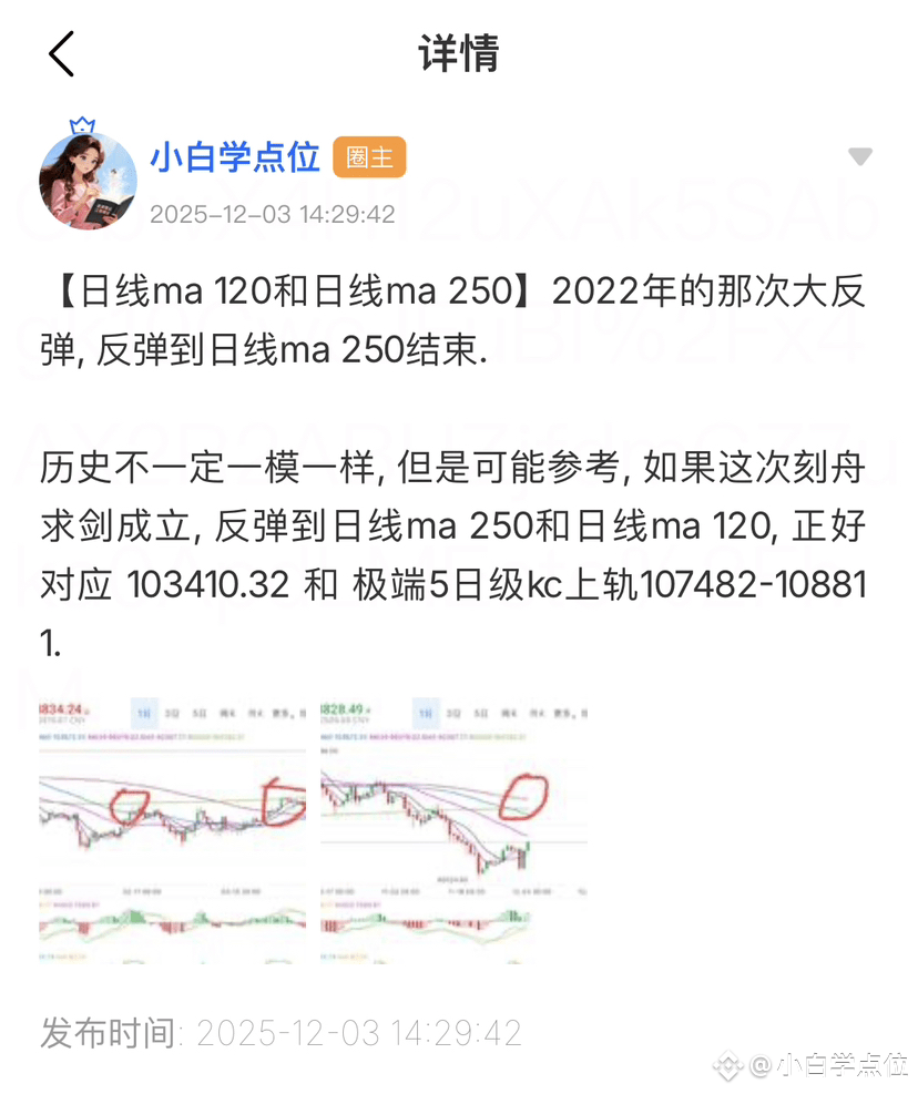 历史不一定一模一样, 但是可能参考, 如果这次刻舟求剑成立, 反弹到日线ma 250和日线ma 120, 正好对应 103410.32 和 极端5日级kc上轨107482-108811.