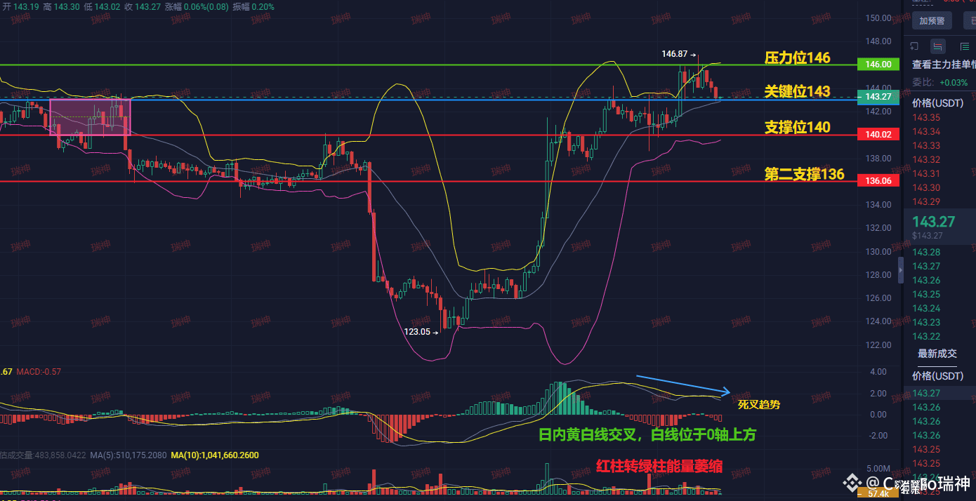 看一小时图,SOL卡在143关键位上不去也下不来,MACD已经出现死叉趋势,上涨动能明显萎缩。更危险的是,上方145-146是明确的“空头压制区”,就像一道高压电网。