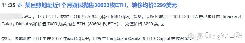 今天有消息说,一个老巨鲸近一个月抛了3万多枚ETH,均价3299美元,听起来吓人,但白玥觉得这反而是“纸老虎”。