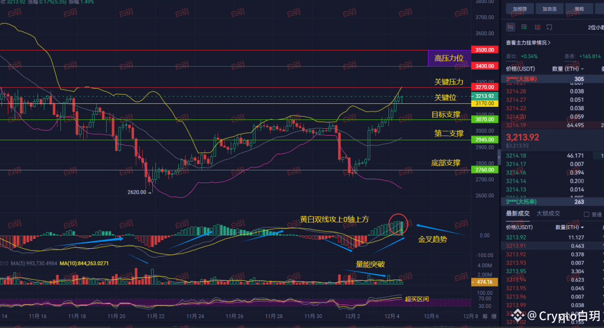 我的判断是:ETH这波行情没走完,巨鲸抛售只是小浪花。基本面看,以太坊生态活跃,加上明年升级预期,长期依然看好。现在价格在3212,接近支撑位,反而是低吸机会。散户别被消息吓到,技术面金叉+量能突破,是多头主力在“洗盘”,目的就是甩掉不坚定的人。