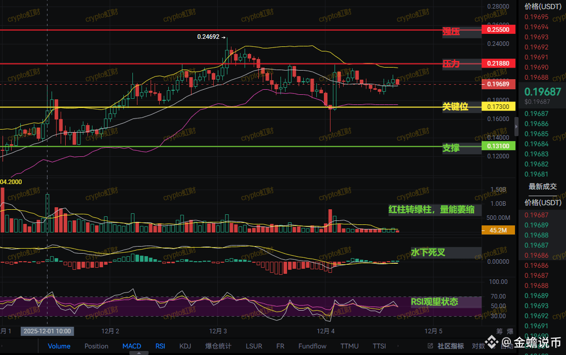 这 1 小时图就是跌了晃悠的状态MACD 那绿柱子还耷拉着,等于暂时没劲儿往上冲;RSI 也蔫蔫的。眼下 0.173 是保命线:今晚只要不跌破这数,它指定还得去撞 0.2188 那堵墙;要是跌破了,直接往 0.1310 那支撑摔,到时候想跑都费劲。