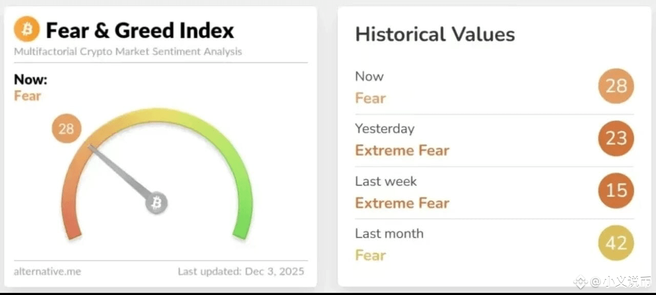市场情绪方面,根据 Alternative.me 数据,今天加密货币恐慌与贪婪指数回升至 28,虽然仍处于「恐慌」区间,但相比昨天的 23(极度恐慌),情绪已明显好转,市场正出现一丝回暖迹象。