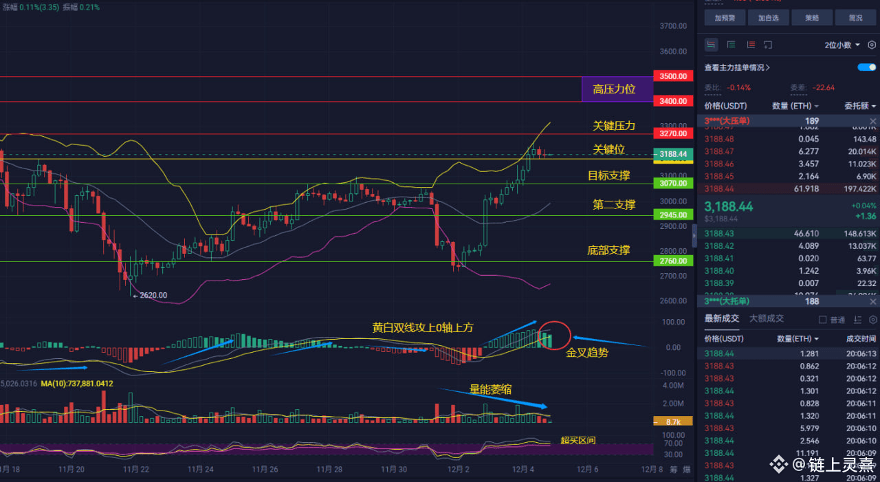 ETH的4小时K线整体是上涨趋势,MACD白黄线攻上0轴上方,还形成了金叉,这通常是多头信号,预示价格可能继续上扬。关键位3180就像一道门,冲过去就能打开3270-3400的反弹空间。但诡异的是,量能却在萎缩——这说明市场追高的人少,主力可能在观望。如果价格不能放量突破3180,小心短线回调!那会跌到哪里?是3070的支撑,还是更深的2945?别急,我后面会透露我的预判点位。
