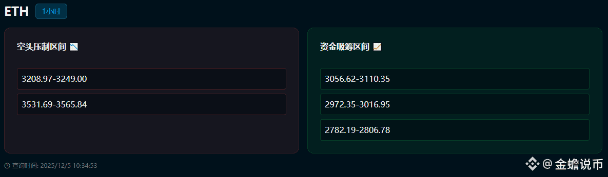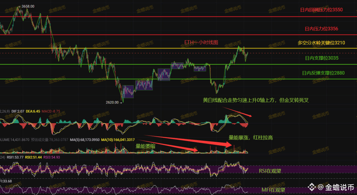 1 小时图明摆着 跌累了喘口气3035 那支撑跟焊死了似的没破,现在反弹往上拱,但 MACD 还在死叉状态,等于 “劲儿没全回来”。核心就盯 3210 这道坎:今晚能冲过去,直接奔 3550 的压力位;要是冲不过去,指定摔回 3035 再测一遍支撑,甚至往 2880 滑。