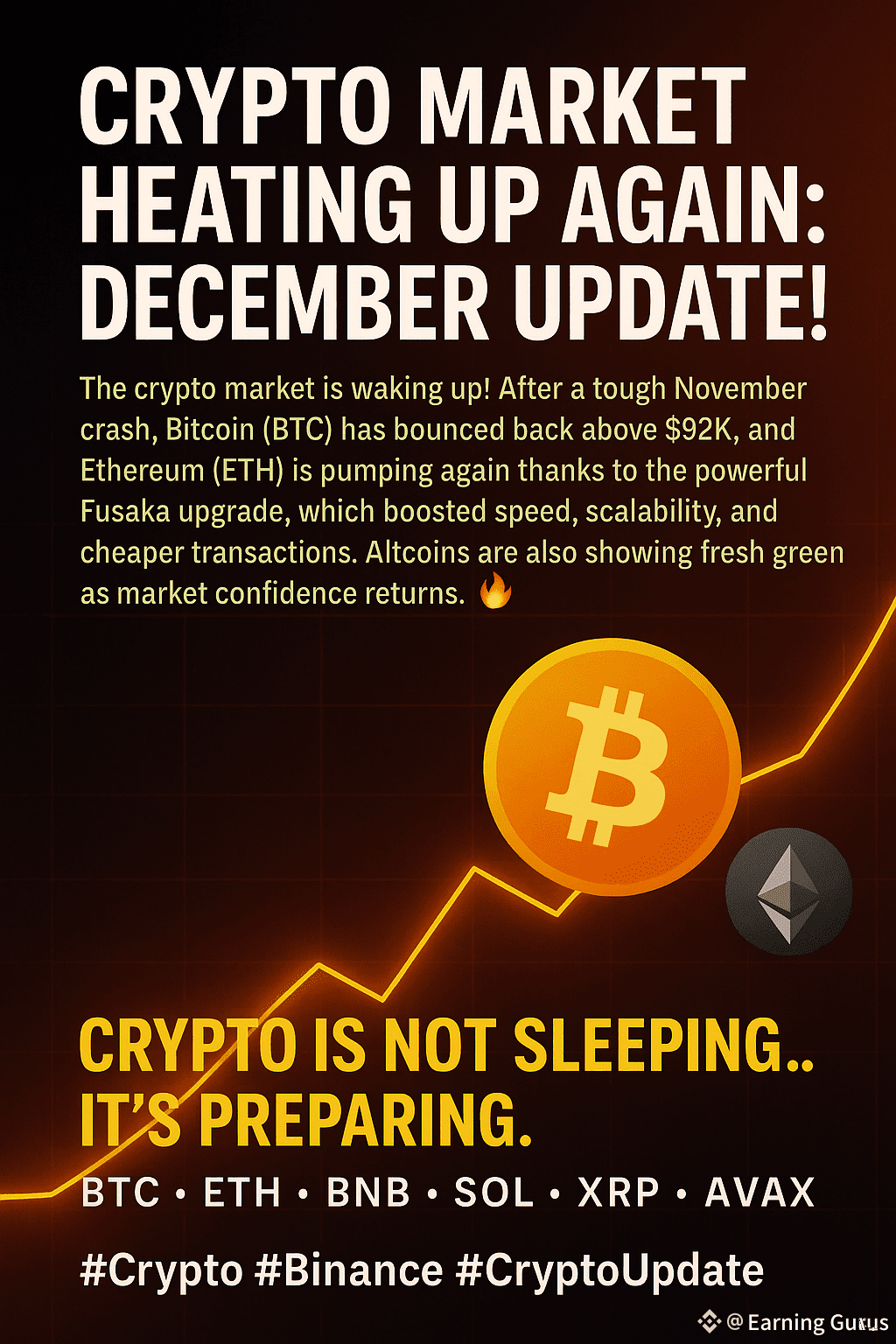 The crypto market is waking up! After a tough November crash, Bitcoin (BTC) has bounced back above $92K, and Ethereum (ETH) is pumping again thanks to the powerful Fusaka upgrade, which boosted speed, scalability, and cheaper transactions. Altcoins are also showing fresh green as market confidence returns. 🔥
