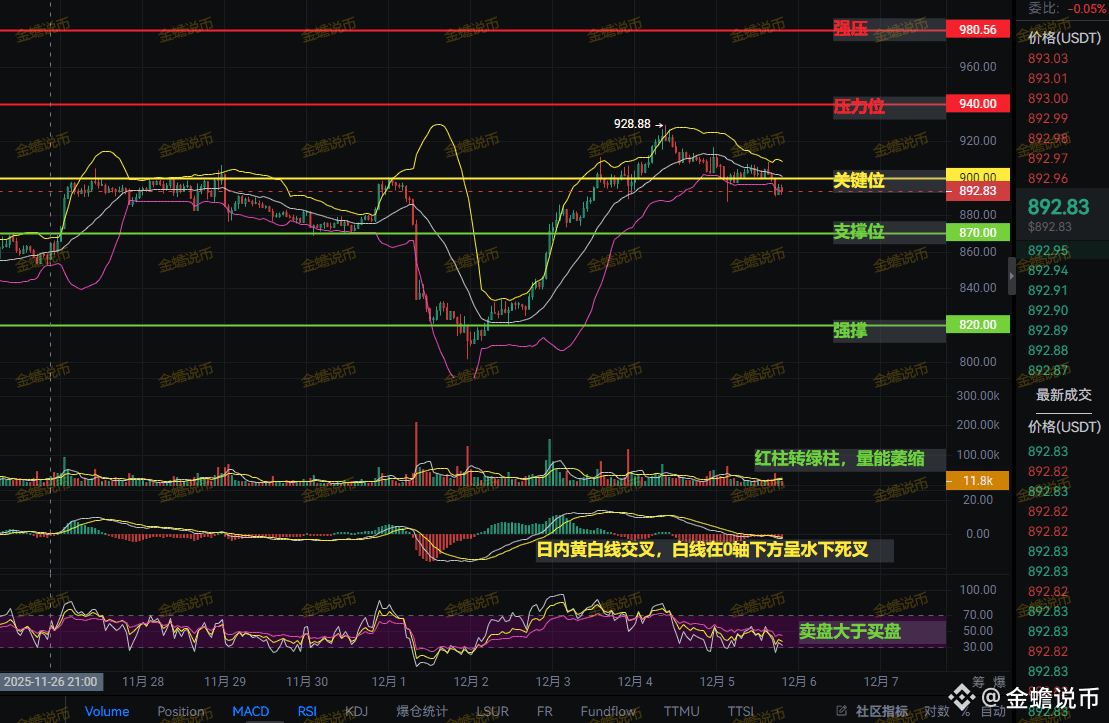 支撑 870、压力 940 是明牌:今晚守住 870,反弹破 900 是板上钉钉;就算砸穿,820 强撑也能兜住。