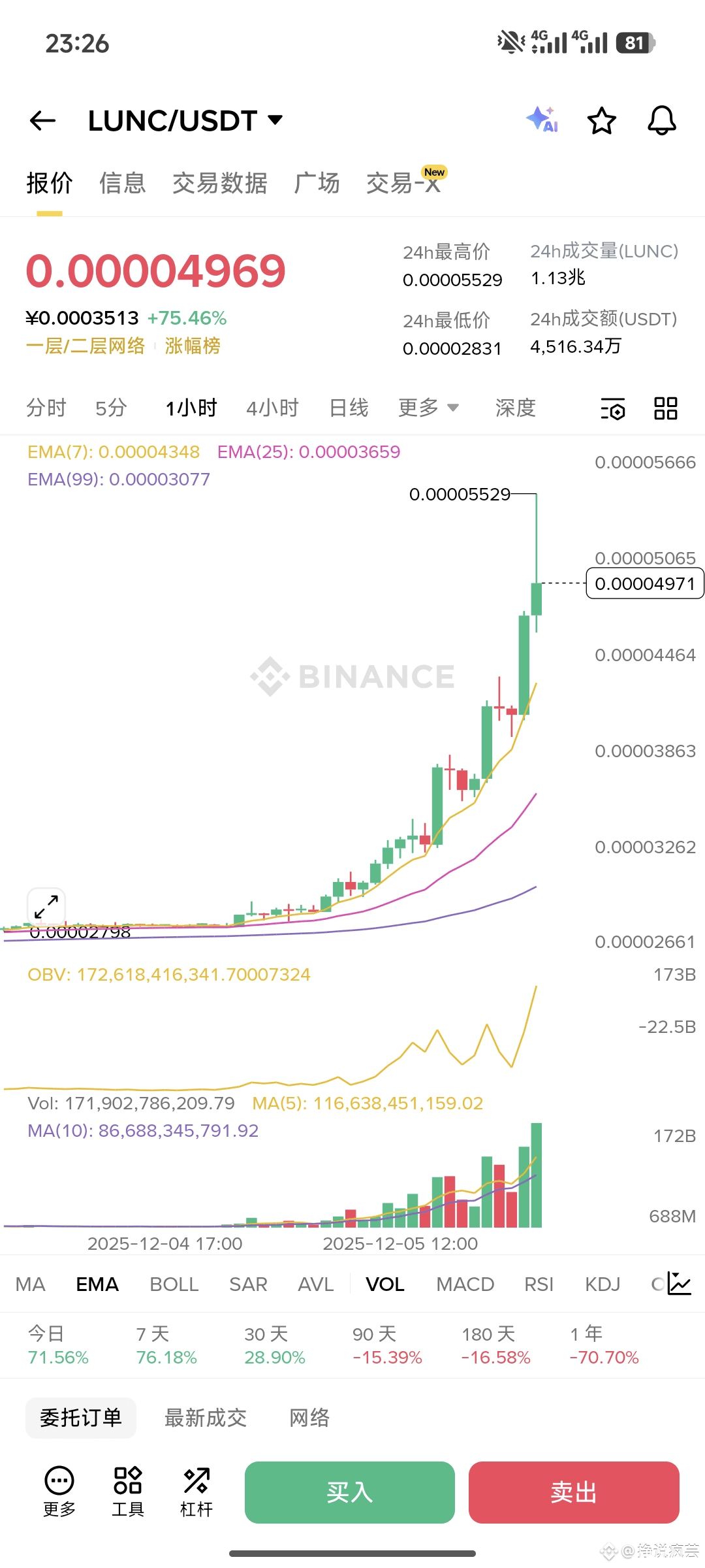 今天涨了75%,现在才0.000049美元,是因为: