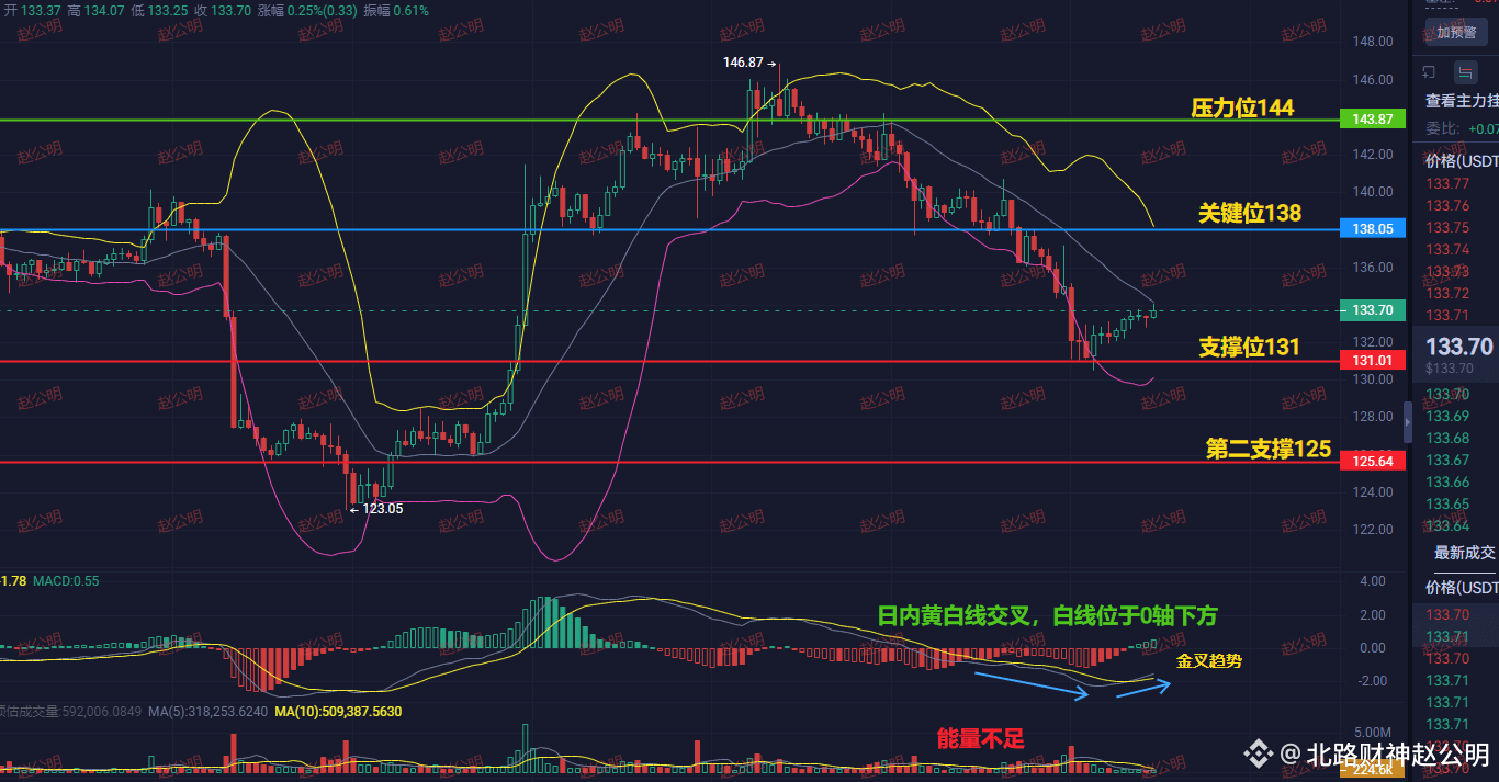 MACD虽然在零轴下方金叉,但“能量不足”,说明反弹很虚弱。如果价格连134.5-135都冲不过去,大概率会再次下探,第一支撑看131.5-132.5,强支撑在131。