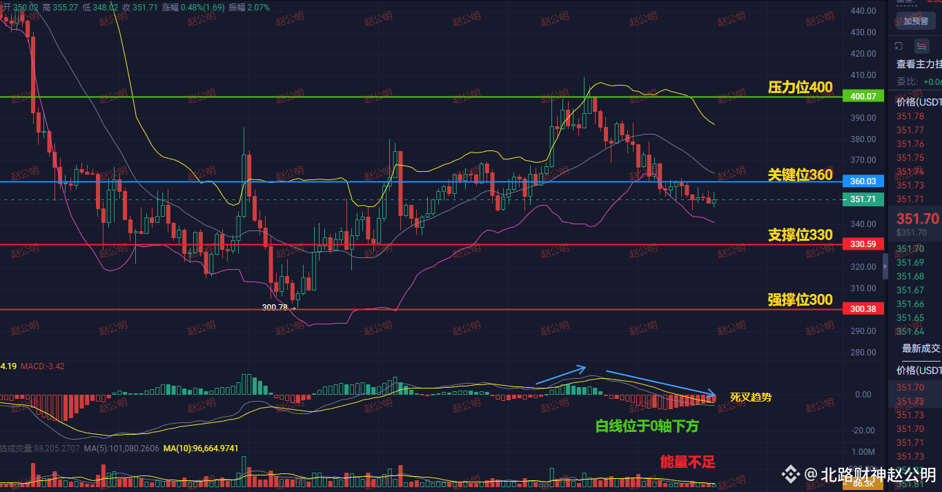 1小时图清清楚楚:360是短期多空分水岭,站上去才能看400;站不上去,空头就会发力砸盘。MACD死叉在零轴下方,能量萎靡,空头完全掌控节奏。